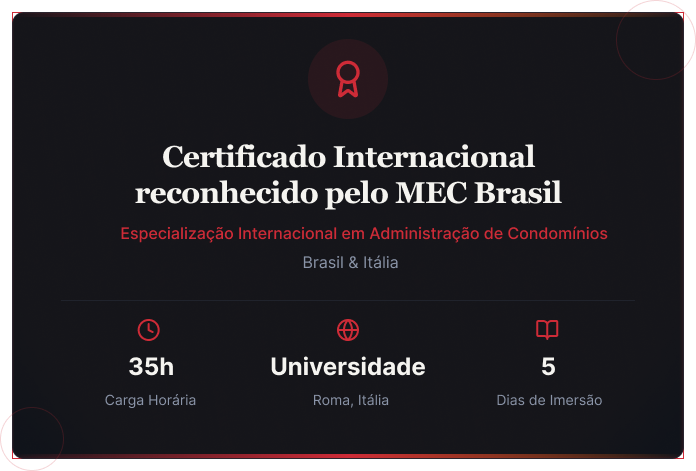 Uma formação completa que abrange todos os pilares essenciais da administração condominial moderna, com perspectiva internacional.