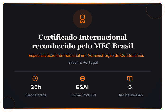Uma formação completa que abrange todos os pilares essenciais da administração condominial moderna, com perspectiva internacional.